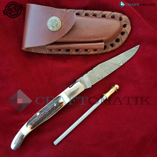 Laguiole Damascus Folding Knife | Pocket Knife Jack Knife | Deer Stag, Steel, Brass Pins Grip| Handmade Damascus Outdoor Camping Knife | FK03