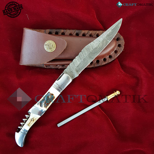 Laguiole Damascus Folding Knife | Pocket Knife Jack Knife | Deer Stag, Steel Grip with Cork Screw | Handmade Damascus Outdoor Camping Knife | FK22