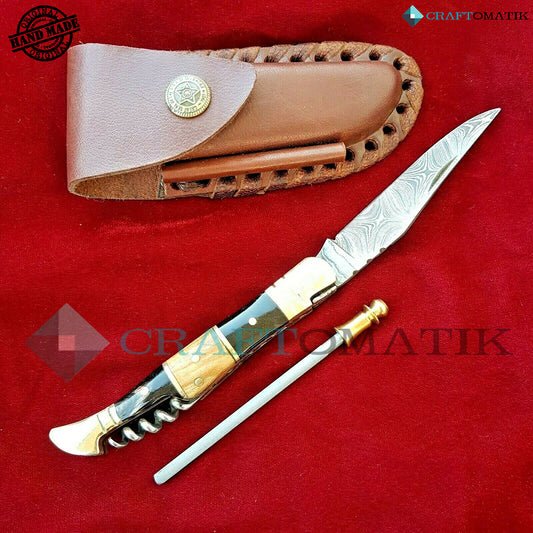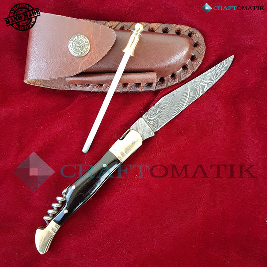 Laguiole Damascus Folding Knife | Pocket Knife Jack Knife | Buffalo Horn, Brass Grip with Cork Screw | Handmade Damascus Outdoor Camping Knife | FK23