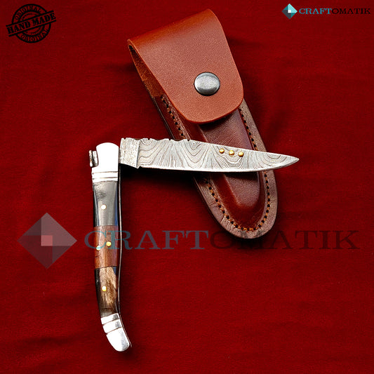 Laguiole Damascus Folding Knife | Pocket Knife Jack Knife | Buffalo Horn, Rose Wood, Steel, Brass Pins Grip | Handmade Damascus Outdoor Camping Knife | FK25