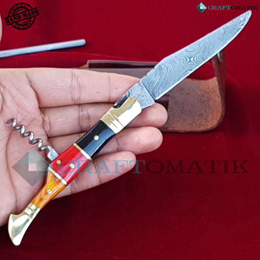 Laguiole Damascus Folding Knife | Pocket Knife Jack Knife | Germany Flag colors, Wood and Brass Grip with Cork Screw | Handmade Damascus Outdoor Camping Knife | FK26