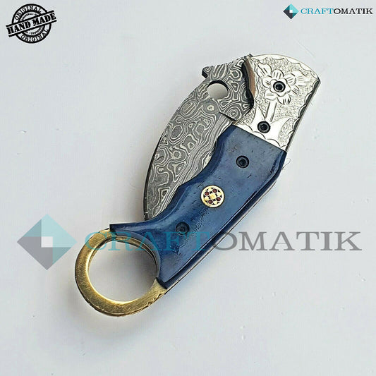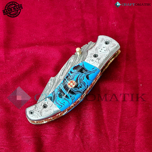 Engraved Damascus Folding Knife | Pocket Knife Jack Knife | Resin, Steel, Mosaic Pin Grip | Handmade Damascus Outdoor Camping Knife | FK45