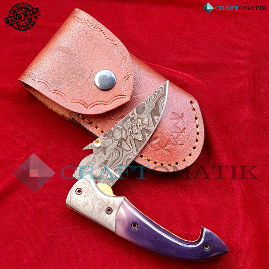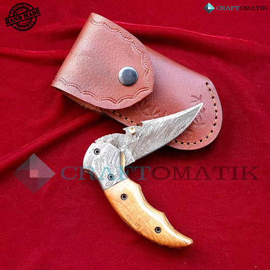 Damascus Folding Knife | Pocket Knife Jack Knife | Curve Crow shape Blade | Camel Bone, Brass, Mosaic Pin Grip | Handmade Damascus Outdoor Camping Knife | FK38