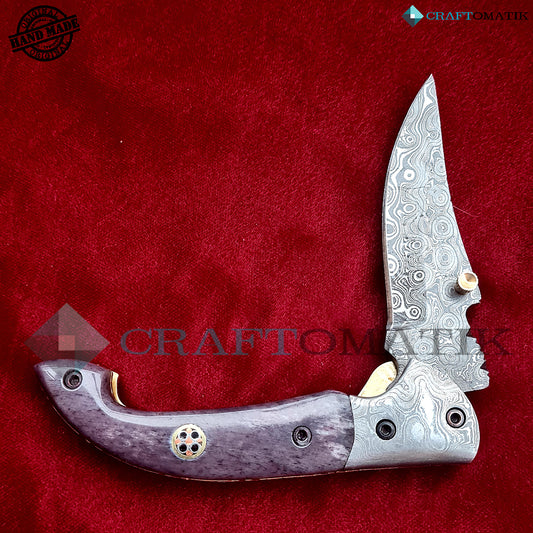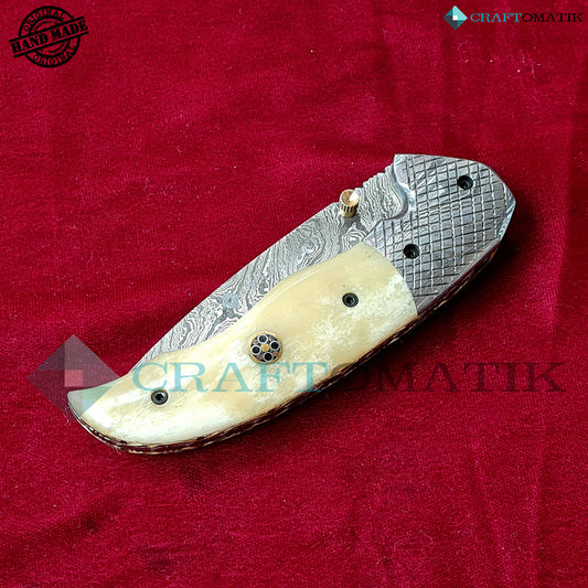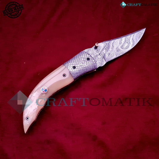 Damascus Folding Knife | Pocket Knife Jack Knife | Camel Bone, Steel, Mosaic Pin Grip | Handmade Damascus Outdoor Camping Knife | FK50