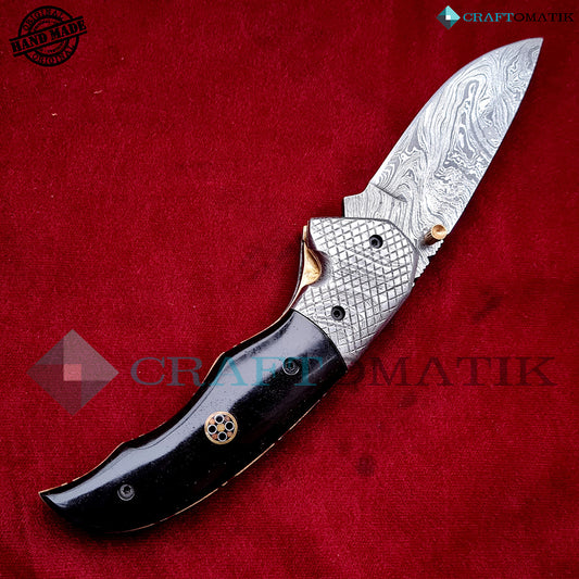 Engraved Damascus Folding Knife | Pocket Knife Jack Knife | Buffalo Horn, Ebony Wood, Steel Grip | Handmade Damascus Outdoor Camping Knife | FK51