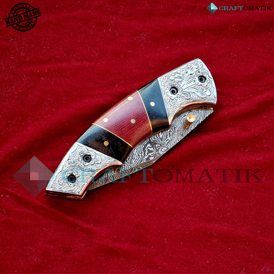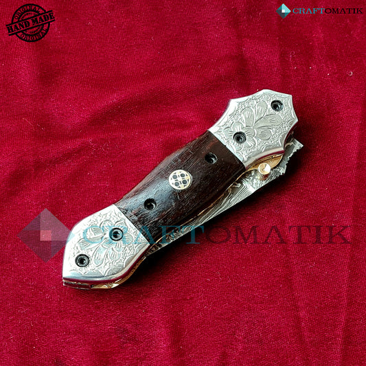 Damascus Folding Knife | Pocket Knife Jack Knife | Rose Wood, Steel, Brass, Mosaic Pin Grip | Handmade Damascus Outdoor Camping Knife | FK46