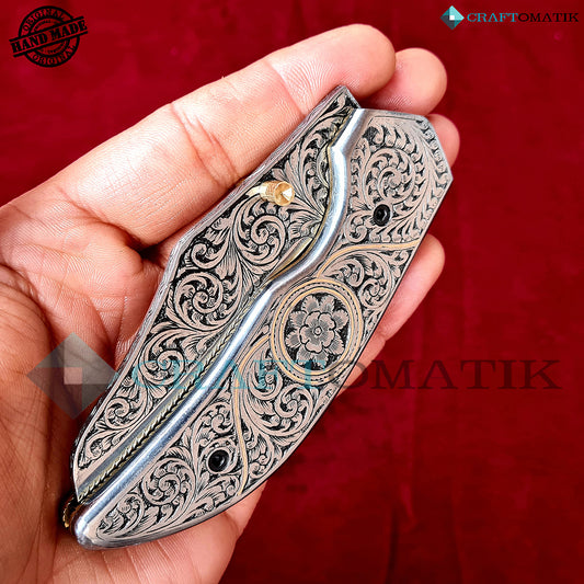 Hand-engraved Folding Knife | Pocket Knife Jack Knife| 440C stainless steel Blade | Steel and Brass Wire Grip | Handmade Outdoor Camping Knife | FK48