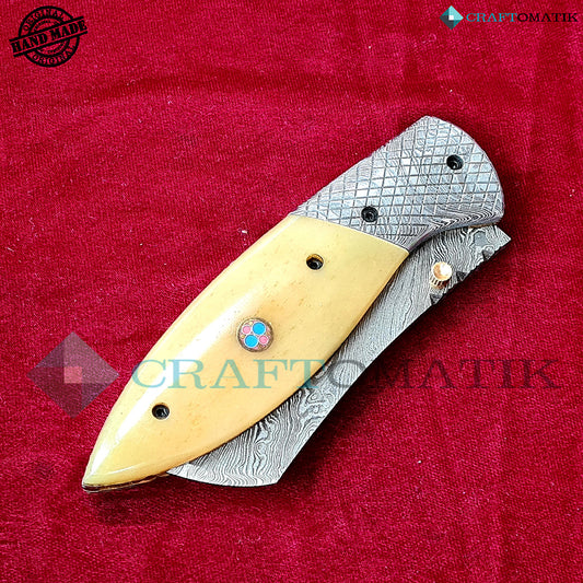 Damascus Folding Knife | Pocket Knife Jack Knife | Camel Bone, Steel, Mosaic Pin Grip | Handmade Damascus Outdoor Camping Knife | FK43-YW