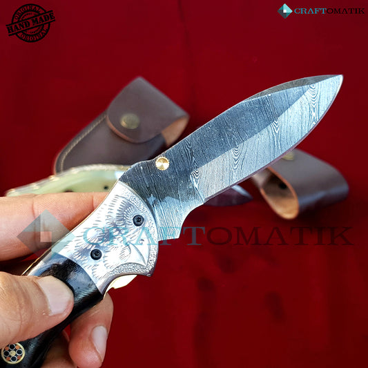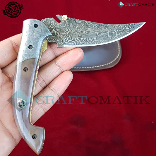 Eagle Damascus Folding Knife | Pocket Knife Jack Knife | Engraved Steel, Buffalo Horn, Mosaic Pin Grip | Handmade Damascus Outdoor Camping Knife | FK28-BK