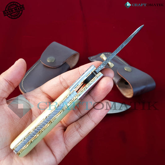 Damascus Folding Knife | Pocket Knife Jack Knife | Camel Bone, Damascus Steel, Brass Grip | Handmade Damascus Outdoor Camping Knife | FK32