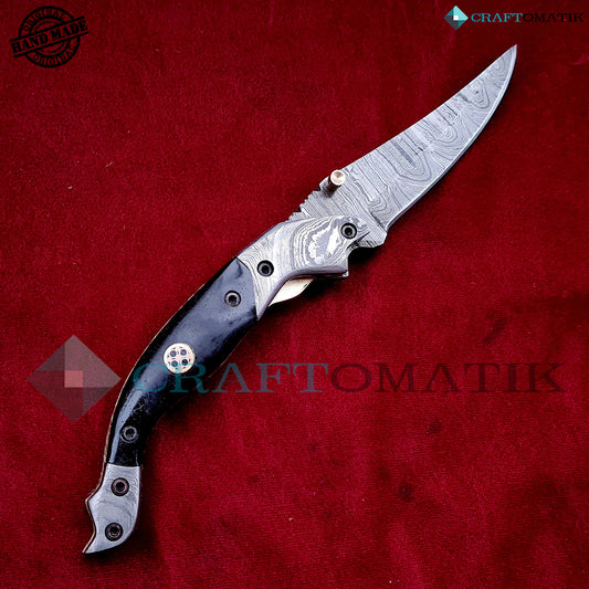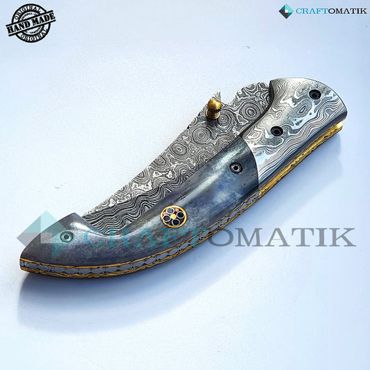 Damascus Folding Knife | Pocket Knife Jack Knife | Buffalo Horn, Damascus Steel, Mosaic Pin Grip | Handmade Damascus Outdoor Camping Knife | FK29