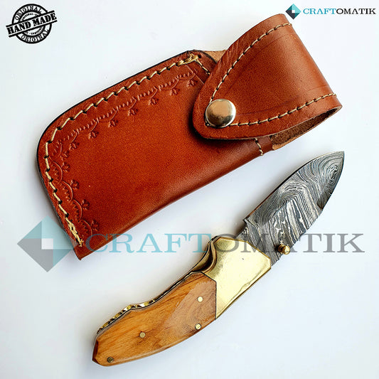 Damascus Folding Knife | Pocket Knife Jack Knife | Walnut Wood, Brass Grip | Handmade Damascus Outdoor Camping Knife | FK06