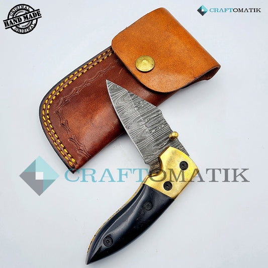 Damascus Folding Knife | Pocket Knife Jack Knife | Buffalo Horn, Brass Grip | Handmade Damascus Outdoor Camping Knife | FK08
