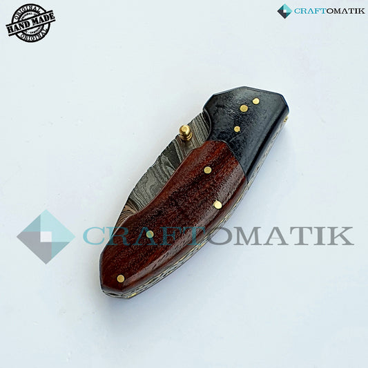Damascus Folding Knife | Pocket Knife Jack Knife | Walnut Wood, Ebony Wood, Brass Pins Grip | Handmade Damascus Outdoor Camping Knife | FK13