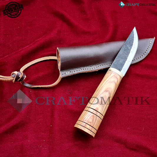 Mittelalter Messer | Handgefertigt Messer | Wikinger Messer | 21 cm | Carbonstahl + Olivenholz | Messertasche | LARP | HFK25